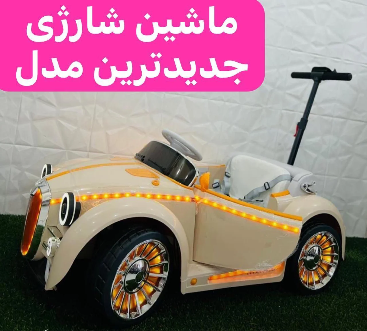 ماشین شارژی کد 1127-1 با چهار موتور، لاستیک گوشتی و صندلی چرم، 24 ولت، کنترل دار با رقص نور و موزیک ایرانی فلش خور، تحمل وزن تا 300 کیلوگرم، همراه کنترل بلوتوثی متصل به گوشی، ویژه و منحصربهفرد برای تجربهای بینظیر رانندگی کودکانه.