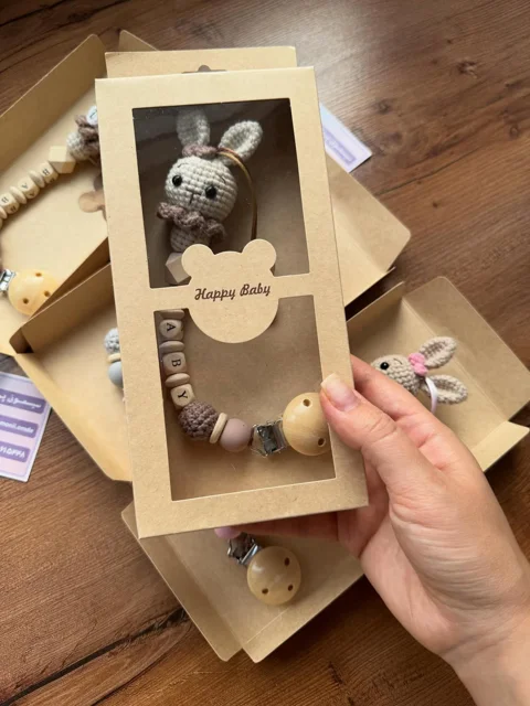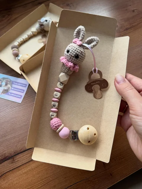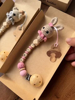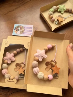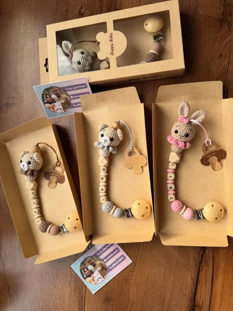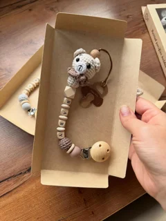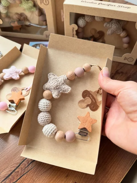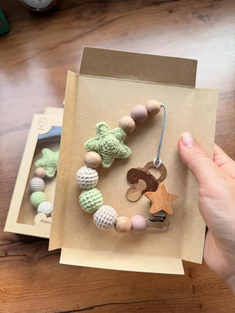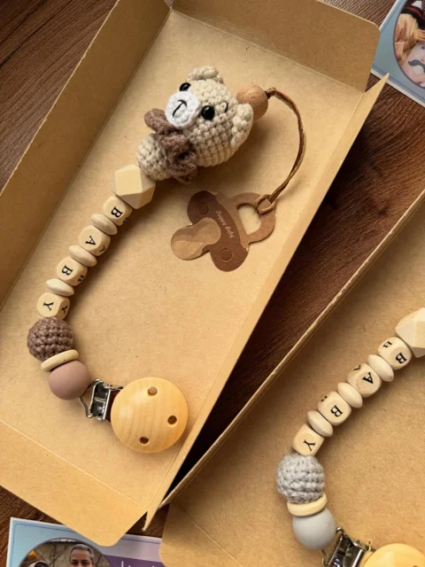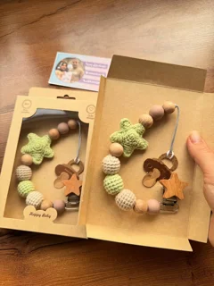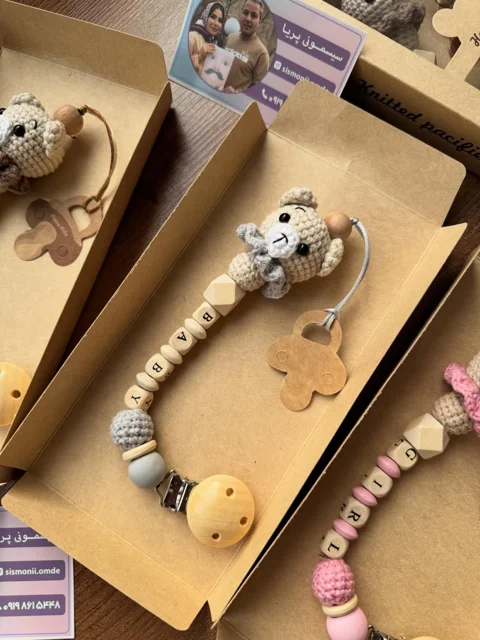 بند پستانک نوزاد ترکیبی از چوب و کاموا یک اکسسوری زیبا