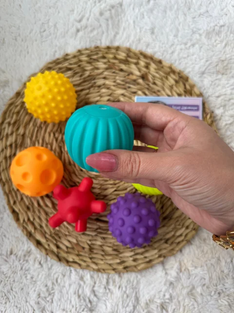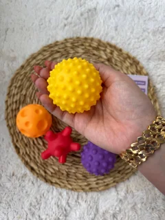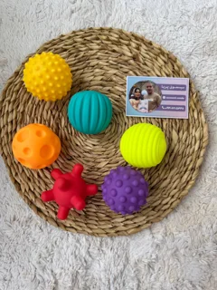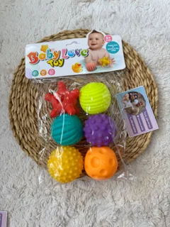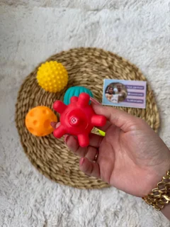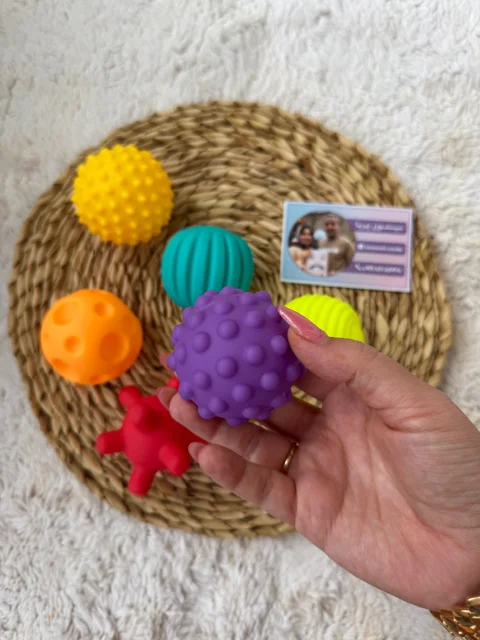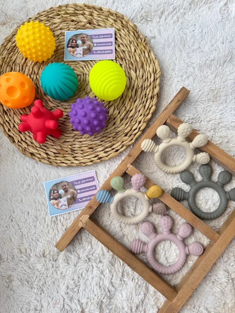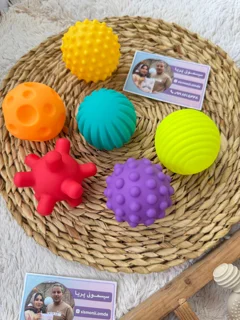 توپ حسی ۶ عددی پوپتی با جنس سیلیکونی و برجستگیهای خاص که به تحریک حس لامسه کودک کمک میکند و به عنوان دندانگیر نیز قابل استفاده است.